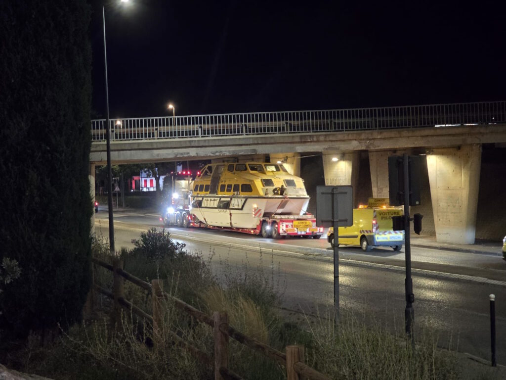 Bereits auf den ersten Kilometern des Schwerlast-Transportes ins Rheinland gab es einige Brücken zu passieren, an welchen Zentimeter-Arbeit gefragt war. Dank der hydraulisch absenkbaren Spezialauflieger und der großen Erfahrung der LKW-Fahrer und der Transport-Begleiter konnten unsere Tenderboote problemlos alle Brücken passieren.